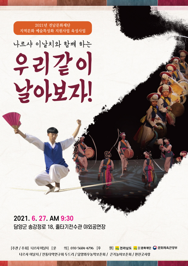 이날치의 줄타기를 복원, 보존하고 있는 단체 ‘나르샤 이날치’(대표 박이식)가 오는 27일 오전 9시30분 담양 줄타기전수관(담양군 송강정로18) 야외공연장에서 ‘우리같이 날아보자!’ 공연을 펼친다.