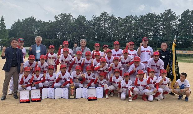 송정동초가 지난 24일 본량구장에서 끝난 광주시야구소프트볼협회장기 초등학교 대회에서 우승을 차지한 뒤 기념 촬영을 하고 있다. 이 대회는 송정동초 박태범 감독(맨 뒷줄 오른쪽에서 네 번째)의 마지막 대회였다. <광주시야구협회 제공>