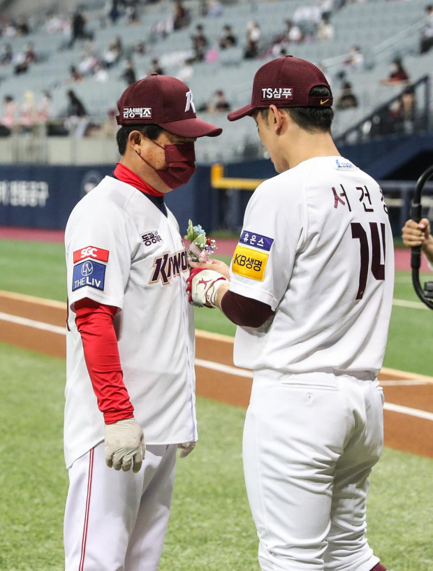 | 박태범 감독은 지난 5월 15일 키움과 한화의 경기가 열린 고척스카이돔을 찾아 시구한 뒤, 제자 서건창으로부터 카네이션을 선물 받았다. <키움 히어로즈 제공> |