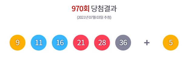 제 970회 로또복권 추첨에서 ‘9, 11, 16, 21, 28, 36’이 1등 번호가 됐다. 1등 당첨금은 16억1154만4045원이다.