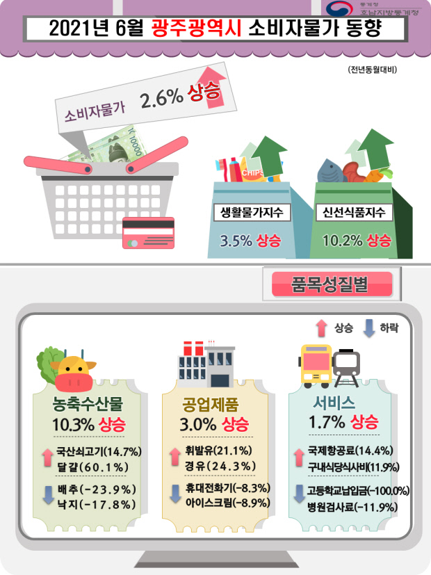 6월 기준 주요 농축수산물 가격은 오이(광주 60.6%·전남 37.6%), 사과(광주 48.3%·전남 72.1%), 배(광주 36.5%·전남 41.1%), 풋고추(광주 33.3%·전남 21.0%), 고춧가루(광주 25.6%·전남 47.2%), 쌀(광주 15.1%·전남 14.6%), 국산쇠고기(광주 14.7%·전남 9.0%), 돼지고기(광주 2.2%·전남 9.1%) 등이 큰 폭으로 올랐다.