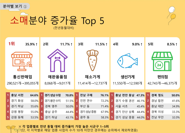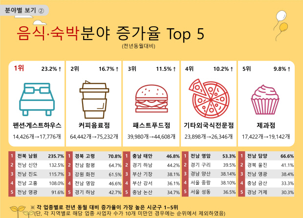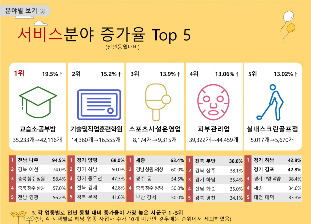 이외 광주 동구 스포츠시설 운영업 사업자가 22개에서 34개로 늘며 증가율 3위(54.5%)에 올랐고, 화순 피부관리업은 20개에서 27개로 증가하며 증가율(35.0%) 4위에 올랐다.