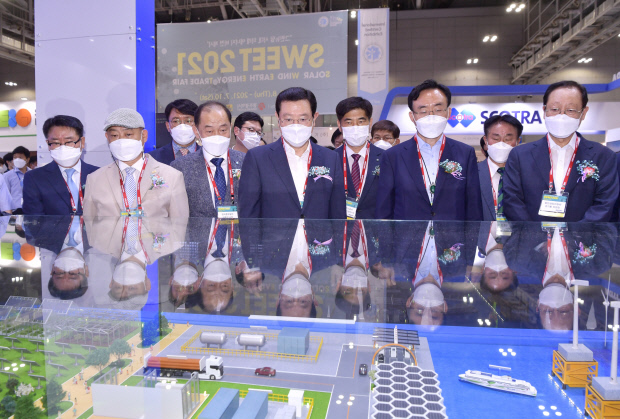 8일 오후 광주 서구 김대중컨벤션센터에서 국제 신재생에너지 전시회 ‘SWEET 2021’ 이 개막했다. 이용섭 광주시장과 윤병태 전남도 정무부지사, 권기홍 동반성장위원장 등 개막식 참석자들이 전시관을 둘러보고 있다.