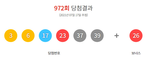 제 972회 로또복권 추첨에서 3, 6, 17, 23, 37, 39’이 1등 번호가 됐다. 당첨금은 11억2488만6244원이다.