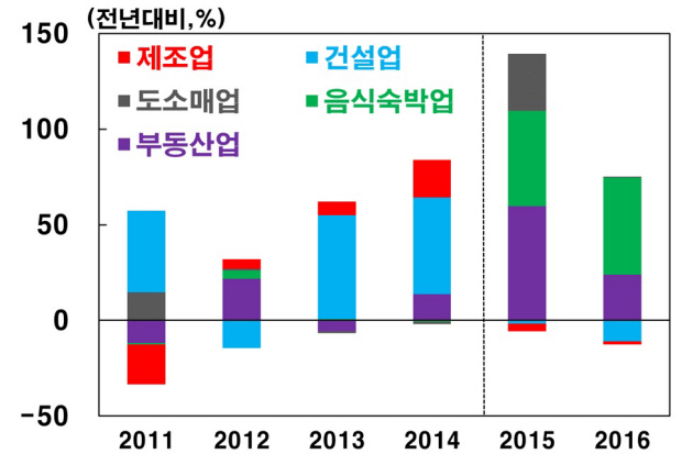 도소매업과 음식·숙박업, 부동산업은 모두 지난 2015년 ‘두 자릿수’ 증가율을 기록하며 급성장했다.