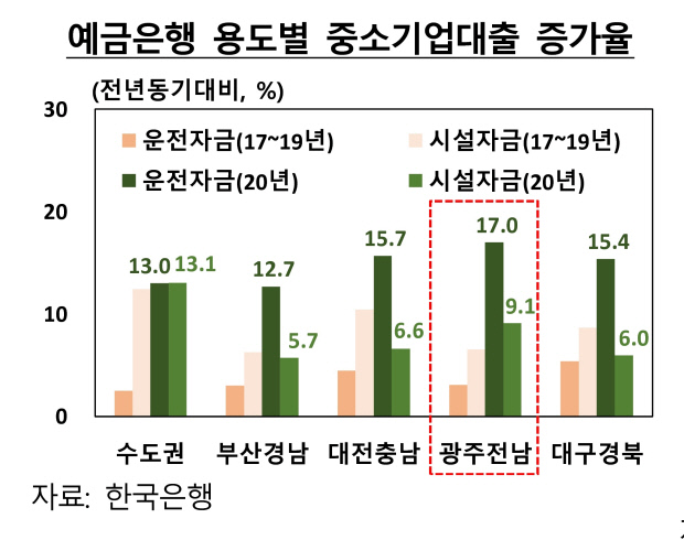 지난해 말 기준 광주·전남 중소기업의 대출 증가율(18.5%)은 과거 평균(17~19년 9.6%)을 크게 넘어섰으며 광역권에서도 가장 높은 수준이라고 보고서는 분석했다.