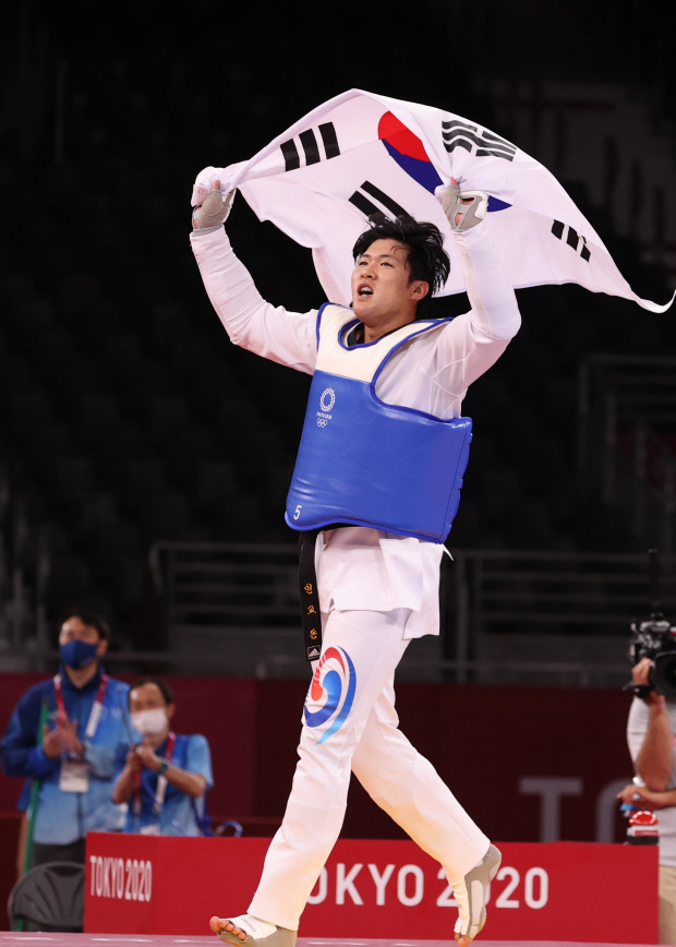 | 남자 태권도 80㎏ 초과급 인교돈이 동메달을 획득한 뒤 태극기를 흔들고 있다. /연합뉴스 |