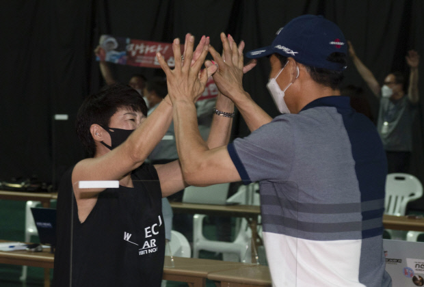 | 안산의 어머니 구명순 씨와 아버지 안경우 씨가 결승전에서 금메달을 획득하자 환호하고 있다. /최현배 기자choi@kwangju.co.kr |