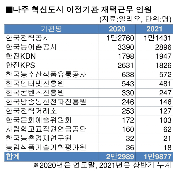 코로나19 대유행 2년차를 맞은 올 상반기 나주 빛가람혁신도시에 본사를 둔 공공기관·공기업들의 재택근무 인원이 2만명에 육박했다.