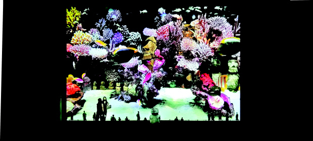 미술관 벽면 전체를 활용한 대형 스크린을 통해 만나는 거대한 수족관은 압도적이다. 이진준 작가의 ‘모아나이아(MOANAIA)’는 남태평양 바다속을 묘사한 환상적인 작품이다. 화려한 컬러로 시작해 혼탁한 흑백으로 마무리되는 5분 분량의 작품은 실제 촬영한 영상과 AI를 활용한 편집이 아우러져 가상과 실제를 동시에 보여준다. 물 속에 잠긴 석상과 화려한 바닷속 생물체들, 바닥에 어른거리는 인간의 모습은 주류 세계사에서 소외된 오세아니아 문화와 환경문제 등에 대한 질문을 던진다.