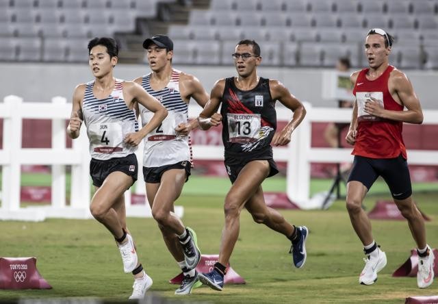 | 근대 5종 레이저 런 경기에서 나란히 달리고 있는 한국의 전웅태와 정진화. /연합뉴스 |