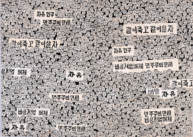 손을 하늘로 뻗어 환희를 표현하는 다양한 인간 군상들을 통해 광주의 해방을 표현한 ‘자유 광주’와 ‘비상계엄 민주주의 만세’ ‘자유 민주’ 등의 플래카드와 다채로운 표정의 수천개의 얼굴을 함께 등장시킨 ‘시민의 힘’, 눈물을 흘리는 사람들의 모습이 인상적인 ‘광주의 레퀴엠’ 등은 오월을 상징하는 작품으로 자리잡았다.