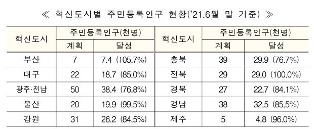 달성률이 가장 높은 혁신도시는 부산으로 7000명 가운데 7400명이 둥지를 틀어 105.7% 비율을 나타냈다.