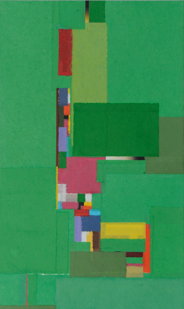 크고 작은 다채로운 한지가 겹쳐지고, 이어지며 만들어내는 화면은 오묘하다. 다양한 색들이 자연스레 서로 스며들며 숱한 표정을 만들어내고, 마치 수묵화의 은은한 번짐처럼 편안한 기운을 전한다.