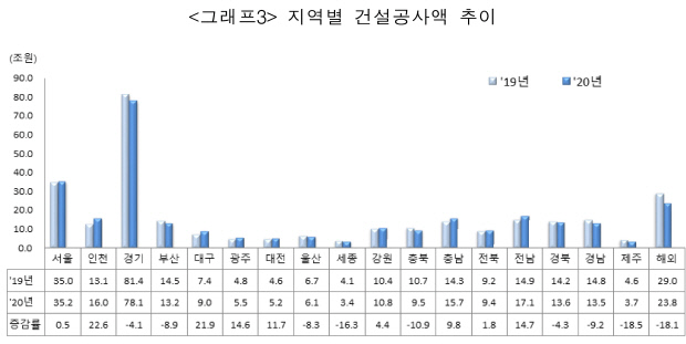 공사액이 크게 늘었음에도 전체 공사액에서 차지하는 비중은 광주 1.9%·전남 5.9%로, 전년보다 각각 0.3%포인트, 0.8%포인트 늘어나는 데 그쳤다. 경기(78조원)와 서울·인천 등 수도권 공사액이 차지하는 비중은 44.8%에 달했다.