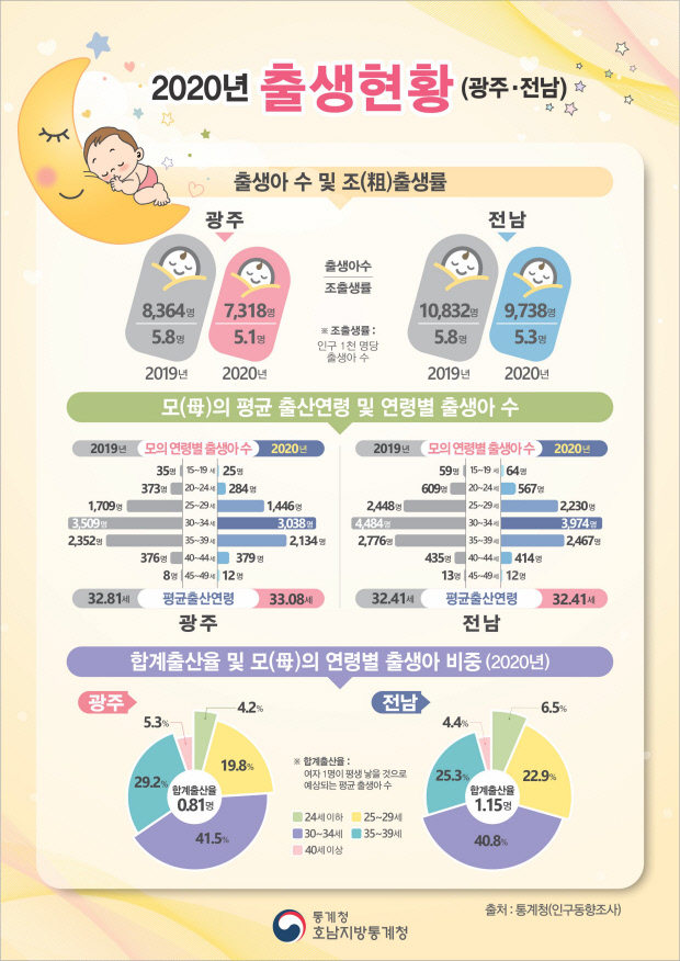 35세 고령 산모 비중은 광주 34.5%와 전남 29.7%로, 전년보다 각각 1.8%포인트 늘고 0.1%포인트 줄었다.