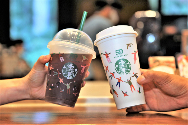 이날 제조 음료를 주문한 고객을 대상으로 글로벌 스타벅스 50주년 기념 특별 디자인이 적용된 그란데(16온즈) 크기 다회용 컵에 음료를 담아 제공했다.