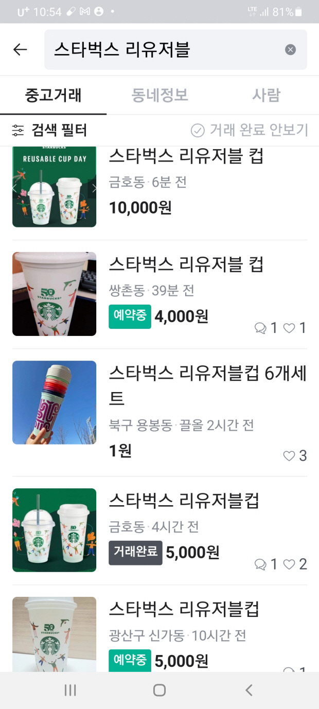 | 지난 28일 ‘주문 대란’을 일으킨 스타벅스 ‘리유저블 컵’은 중고 거래 플랫폼에 개당 4000~6000원 선에 판매되고 있다.<앱 화면 갈무리> |