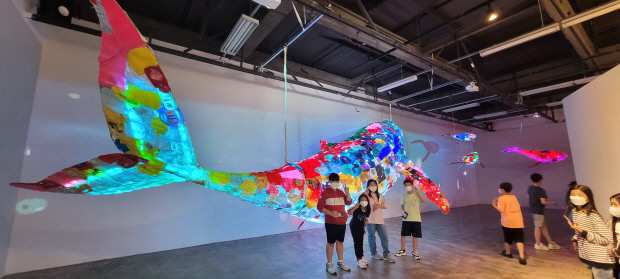 “와, 고래다. 그런데 뭐로 만들었지?” 김상연 작가의 작품 ‘우주를 유영하는 고래’를 본 아이들이 탄성을 지른다. 빨레 세제 용기 등 폐품을 이용해 만든 작품을 신기한 듯 바라보고 사진촬영을 하며 즐거워한다. 노진아 작가가 자신의 엄마를 모델링해 얼굴을 제작하고, 기계를 통해 인간의 표정을 학습하게 한 작품 ‘나의 기계엄마’ 앞에서는 발길을 뗄 줄 모른다. ‘진짜 사람 얼굴’같은 작품이 관람객을 따라한다는 안내자의 말을 듣고선 여러가지 표정을 지어보이며 서로 질문하느라 바쁘다.