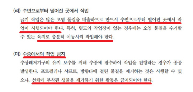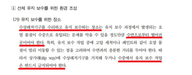 정부는 특성화고 국가직무능력표준(NCS) 방안에 따르면 ‘보트선체 관리’의 경우 수중에서의 작업을 금지하고 있다. 특히 선체에 부착된 따개비 등 생물 제거 활동은 금지한다고 명시됐다. 애초부터 현장실습생에게 시켜서는 안되는 일을 요구했다는 것이다. 근로기준법(65조)도 18세 미만인 자에게 ‘고압작업 및 잠수작업’을 하지 못하도록 하고 있다.