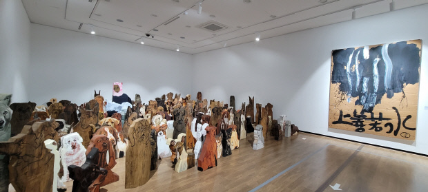그밖에 골판지에 활달한 붓질로 그려나간 김병종의 ‘상선약수’, 아마천에 쪽염색으로 산천을 묘사한 첸징린의 ‘산계모색’, 자신의 키에 맞는 검은색 상여 작품인 이상용의 ‘운명’, 보성 대원사에 있는 법정스님의 글씨와 그림 등을 가져와 꾸민 법정스님의 방도 눈길을 끈다. 이만희·이종상·이응노 등 한국을 대표하는 작가들의 작품은 전시에 무게감을 더한다.