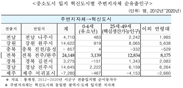 나주 혁신도시 외에도 전북 전주시·완주군(2만4148명), 경남 진주시(1만4645명), 강원 원주시(1만4622명), 경북 김천시(3275명) 등도 주변 지자체로부터 인구 유입이 발생했다.