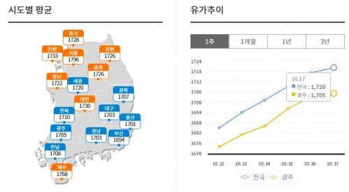 17일 한국석유공사 유가정보서비스 오피넷에 따르면 이날 기준 보통 휘발유 평균 가격은 ℓ당 광주 1705.32원·전남 1708.99원으로, 전날보다 각각 2.67원, 3.57원 상승했다. 광주·전남 휘발유 가격은 지난 16일부터 ℓ당 1700원을 넘겼다.