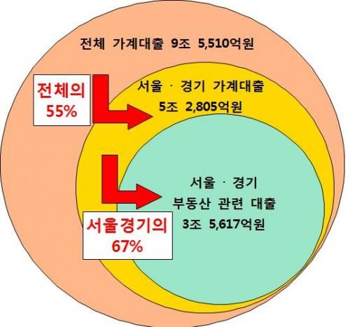 서울 가계대출은 전체의 34.8%에 달하는 3조3259억원이었고, 경기는 20.5%(1조9546억원)으로 뒤를 이었다.