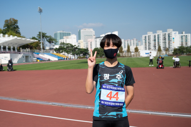 이미옥은 제39회 전국장애인체육대회에서 원반던지기, 창던지기, 포환던지기 3관왕 주인공이다.