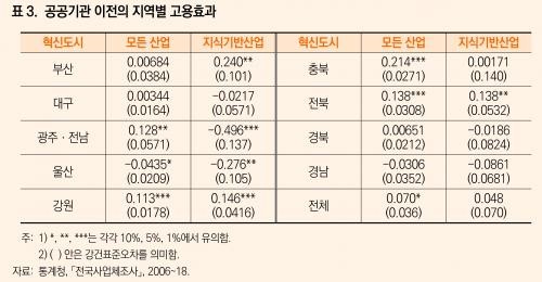 충북(21.4%포인트)과 전북(13.8%포인트), 강원(11.3%포인트), 부산(0.7%포인트), 경북(0.7%포인트), 대구(0.3%포인트) 등 순으로 고용효과가 높았다. 평균적으로 9개 혁신도시 고용효과는 인근 시·도보다 0.7%포인트 높았다.