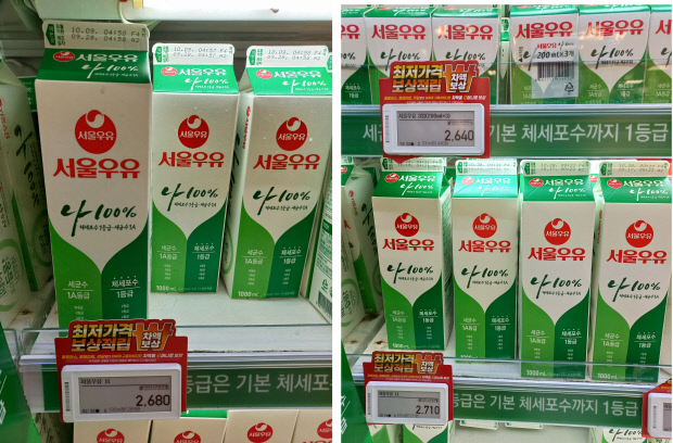 | 우유 업계 1위인 서울우유협동조합은 2540원이던 서울우유 1ℓ 제품을 이달 1일부터 2680원, 2710원으로 총 6.7%(170원) 올렸다. 광주시 광산구 한 대형마트에서 판매된 이달 1일(왼쪽)과 같은 달 22일 가격. |