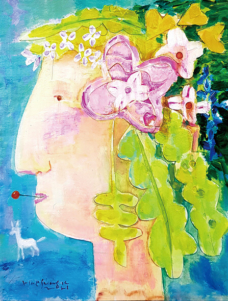 김해성 작가는 좀 수월한 편이었다. 평면 작업인데다, 2년 전부터 이미 하루 한 점 드로잉 작업을 진행하고 있어서다. 그는 자신의 트레이드 마크인 꿈꾸는 이미지의 작품들을 아크릴 등으로 꾸준히 한점씩 그려나갔고, 콜라주 작업 등 다양한 변화도 시도했다. 전시에는 ‘숲을 걷는 사람’, ‘꽃선물 주기’, ‘고양이와 새’ 등 편안하고 행복한 느낌의 작품들이 나왔다.