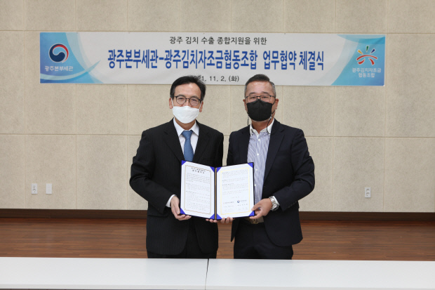 광주본부세관(세관장 정승환·사진 왼쪽)은 2일 광주김치자조금협동조합(이사장 채금진)과 김치 생산기업의 수출경쟁력 강화를 위해 ‘광주 김치 수출 종합지원을 위한 업무협약’을 체결했다.