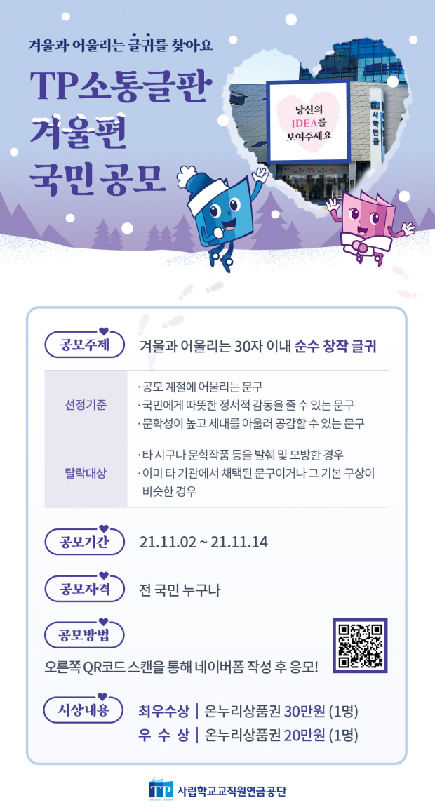 사학연금은 오는 14일까지 ‘사학연금(TP)소통글판 겨울편 문안 공모’를 진행한다고 2일 밝혔다.