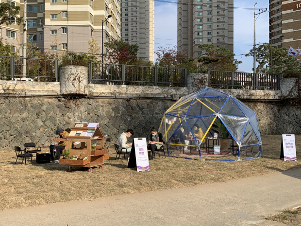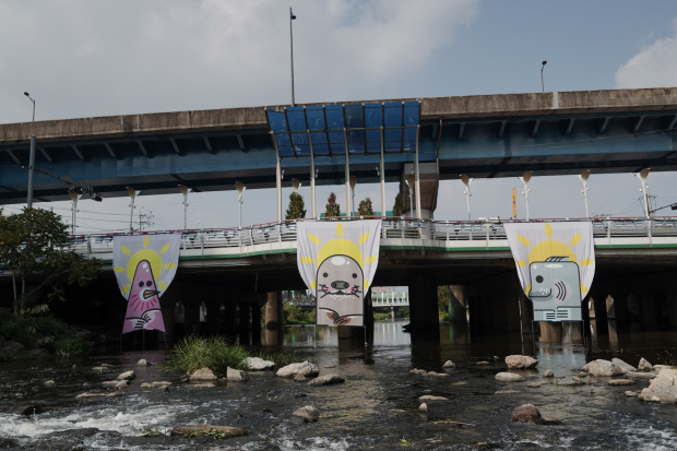 4일 찾은 현장에선 다양한 이벤트가 열리는 작은 돔 형식의 재미있는 구조물을 만났다. 남광주 철교에는 광주천에 살고 있는 수달 등을 소재로 한 이조흠 작가의 작품이 걸려 있다. 도심을 흐르는 광주천은 다양한 행사를 펼치기 좋은 공간임에도 지금까지 활용도가 미흡했던 게 사실. 이번에 아이디어로 무장한 청년들에게 ‘발견’돼 근사한 예술쉼터로 변신했다.