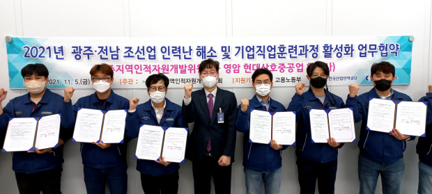 광주지역인적자원개발위원회는 최근 영암 현대삼호중공업 회의실에서 현대삼호중공업 중견 협력사와 ‘광주·전남지역 조선산업 인력난 해결을 위한 기업직업훈련과정 활성화 업무협약’을 체결했다.