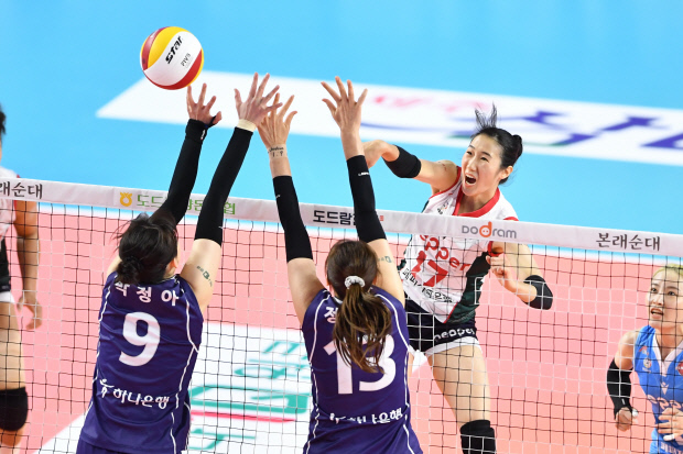 | 하혜진이 지난 29일 도로공사전에서 스파이크하고 있다. 하혜진은 9일 수원 화성종합실내체육관에서 IBK기업은행을 상대하는 AI페퍼스의 핵심 전력이다. <KOVO 제공> |