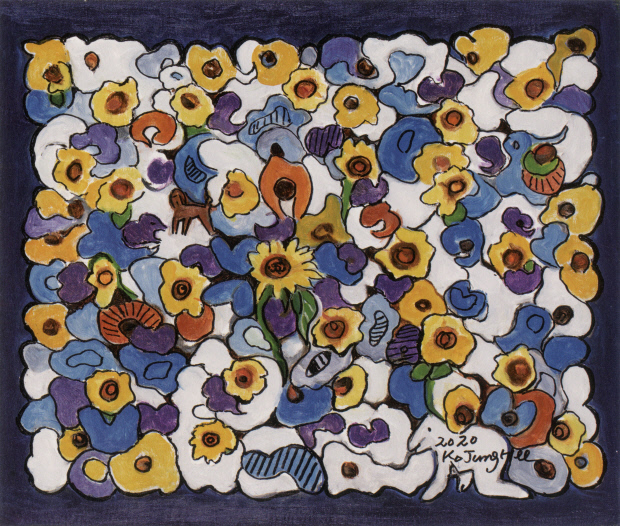 고 화백의 작품에도 꽃과 풍경이 자주 등장하지만, 그 평범한 소재를 풀어내는 방식이 독특해 눈길을 끈다. 사실적인 묘사 보다는 대상의 특질을 포착해 비구상의 느낌을 부여하며 색다른 이야기를 건넨다. 이런 경향은 광주사범학교에서 가르침을 받았던 추상화가 고(故) 강용운 화백의 영향이 컸다. 정형화된 규칙보다는 자유롭고 유연한 터치와 조형에 관심을 갖고 자신만의 시각으로 재해석하려 늘 고민했다.