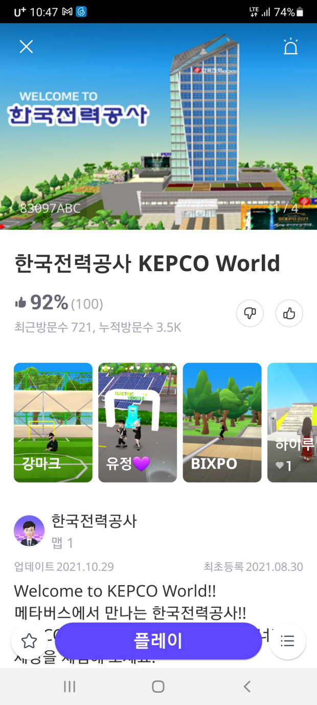 이달 중순까지 3500명이 넘는 국내외 이용객이 메타버스 한전 본사를 다녀갔다. 방문객들은 나주 본사를 배경으로 한 인증 사진 등을 남기며 소감을 남기고 있다.