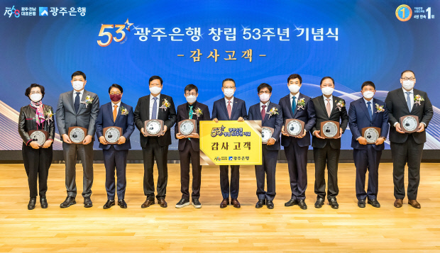 | 지난 19일 열린 광주은행 ‘창립 53주년 기념식’에서 송종욱(가운데) 은행장이 감사고객에게 상패를 전달하고 있다.<광주은행 제공> |