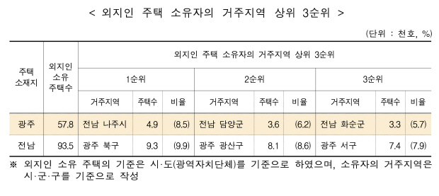 자료에 따르면 지난해 광주지역 외지인 소유 주택 수는 총 5만7800호로, 이 가운데 나주 거주민 보유 주택이 4900호로 가장 많았다.