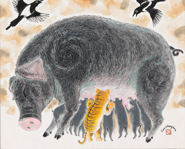 ‘은유와 해학’을 주제로 열리는 이번 전시는 새해에 좋은 소식이 많기를 기원하며 상서로운 기운을 전하는 까치호랑이를 만나는 기획이다. 전시에는 복을 부르는 까치호랑이와 어린아이 시리즈, 도시의 삐에로, 투우를 주제로 한 작품 30여점이 나왔다.