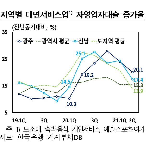 15개 시·도를 대상으로 대면 서비스업 자영업자 대출 증가율을 따지면 광주(20.1%)는 울산(21.7%)에 이어 두 번째로 높았다. 울산과 광주에 이어 경북(18.9%), 경기(18.1%), 전남(17.4%) 등 순으로 나타났다.