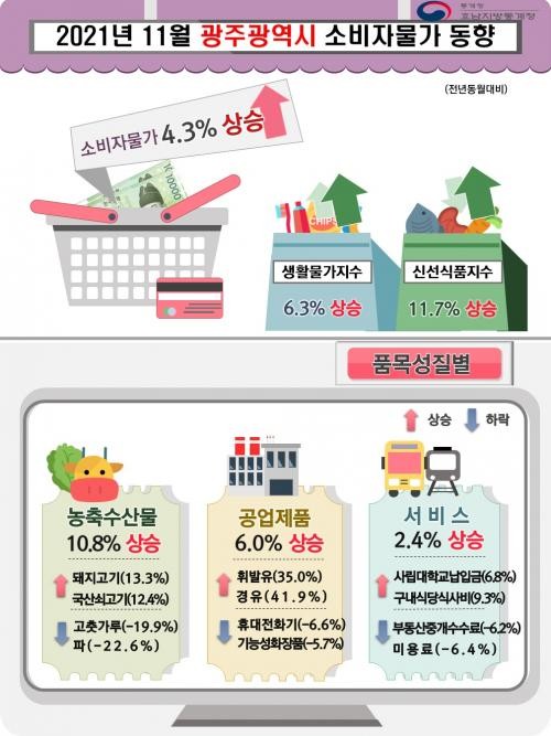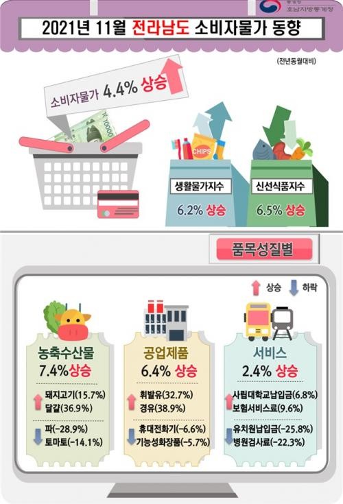 2일 호남지방통계청이 발표한 ‘11월 소비자물가 동향’ 자료에 따르면 지난달 지역 소비자물가지수는 전년 같은 달보다 광주 4.3%·전남 4.4% 상승했다.