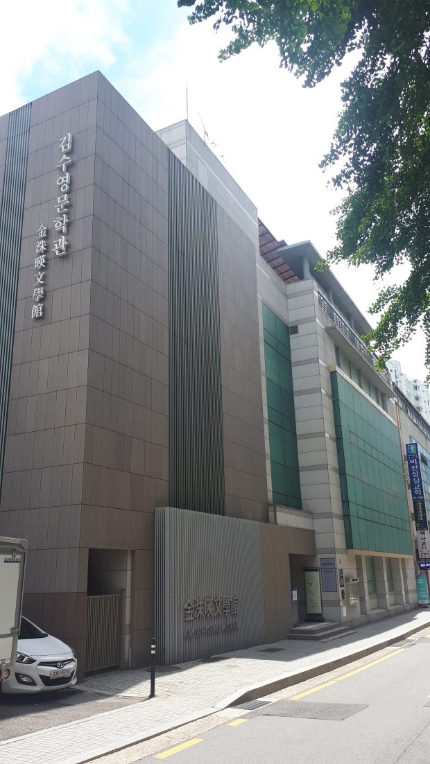 눈에 띄는 것은 건물 외벽에 나무로 형상화한 ‘金洙暎문학관’이라는 조형물이다. 모던함과 이지적, 강인하면서도 나무 특유의 부드러움이 깃들어 있다. 그의 시가 주는 이미지와 닮았다. 조금 멀찍이 떨어져서도 시인의 시 세계가 응결된 문학관이라는 사실을 단번에 알 수 있다.