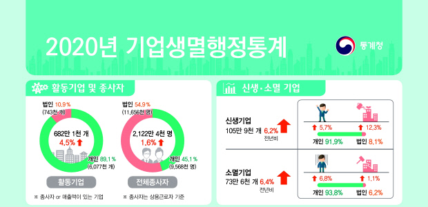 19일 통계청이 최근 발표한 ‘2020년 기업생멸행정통계 결과’에 따르면 지난해 새로 경제활동을 시작해 매출을 내거나 상용근로자를 고용한 신생기업은 광주 2만6695개·전남 3만4249개 등 6만944개로 집계됐다. 신생기업은 전년보다 광주는 623개(2.4%) 늘고 전남은 2463개(7.7%) 증가했다. 전국 신생기업은 전년보다 6.2%(6만2063개) 증가한 105만8842개로 나타났고, 17개 시·도 가운데 충남(12.3%) 증가율이 가장 높았다.