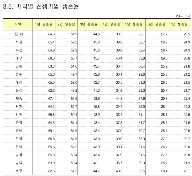 2019년으로부터 3년 전 시작한 신생기업이 버틴 비율은 광주 42.6%·전남 43.9%로, 두 지역 모두 전국 평균(44.5%)을 밑돌았다.