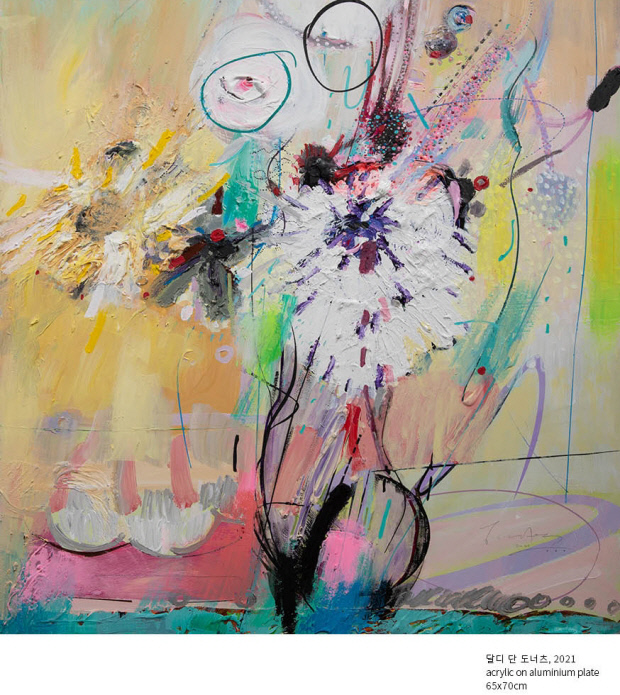 ‘愛子’, ‘달디 단 도넛’ 등의 작품은 한없이 자유롭다. 화면에 펼쳐보이는 다양한 색감의 굵직한 붓질과 때론 두껍고, 때론 가는 다채로운 선, 원 등이 복잡하게 얽히면서 독특한 이미지를 만들어낸다. 또 단순하지만 리듬감이 돋보이는 ‘꽃봉오리’ 작품은 대범한 붓질이 보여주는 율동감이 눈에 띈다.