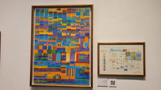 전시장에 걸린 그림 옆의 QR 코드를 입력하면 잔잔한 피아노곡이 흘러나온다. 피아니스트 글렌 굴드가 연주하는 바흐의 ‘평균율 클라이브곡집’ 1권 중 ‘8번 전주곡 BWV853’다. 단순한 색면(色面)의 조합으로만 느껴졌던 작품은 피아노곡을 들으며 바라보면 조금 다른 느낌으로 다가온다. 각각의 색면은 음악 각 마디의 음색과 음형을 작가가 철저히 분석해 만들어낸 것으로, ‘음악이 연주되는 순간’을 회화로 표현해냈다.