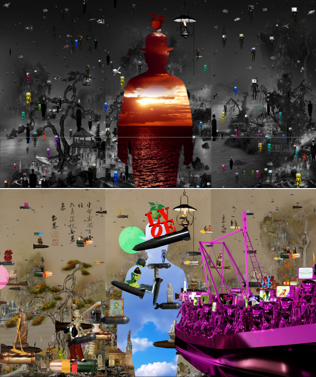 2010년에 이어 11년 만에 본전시에 참가한 이 작가의 출품작은 ‘만화병풍Ⅱ-상상된 경계’. 유기적으로 미묘하게 얽힌 다양한 현대 사회의 이슈들을 담고 있는 ‘만화-병풍Ⅱ-상상된 경계’는 디지털이 만들어낸 유토피아와 디스토피아가 공존하고 대립되는 풍경에 만화적인 요소들을 더해 현실을 풍자하고 있다.